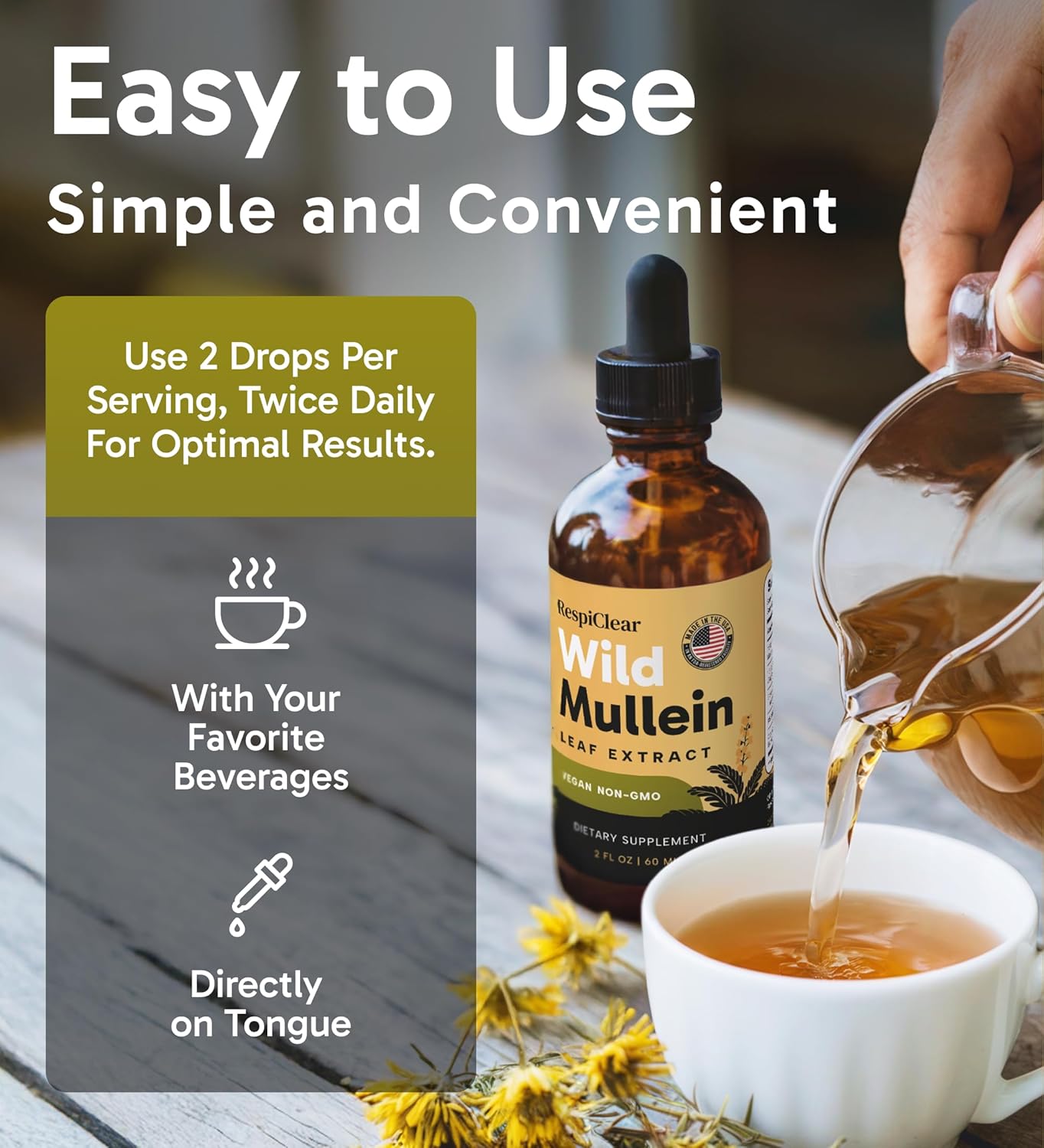 The idea for this formula was born in the Appalachian Mountains, where a master herbalist observed local elders gathering the soft, woolly leaves of the Mullein plant. For generations, these highlanders had brewed Mullein tea to comfort their lungs through harsh winters and long days working in dusty barns.